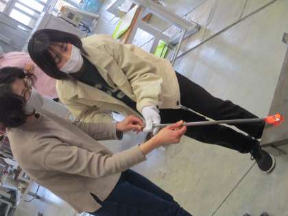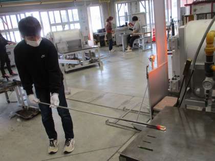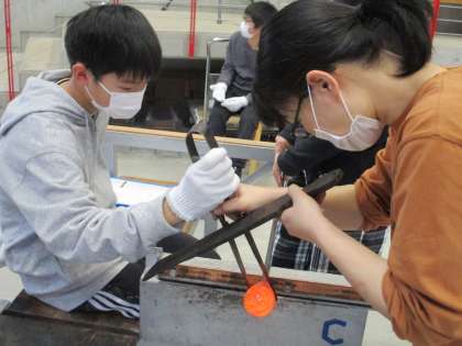 工房に移動し、いよいよガラス細工体験です。職人の方々に丁寧に教えていただきながら、真剣な表情でガラスをのばしたり、色をつけたりしていました。完成が楽しみです。