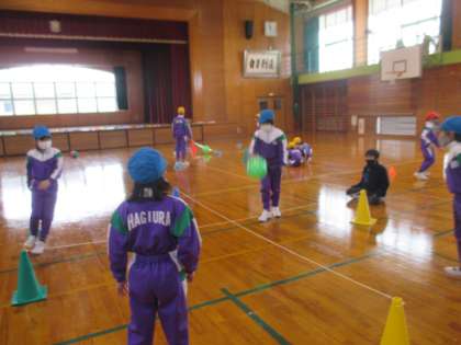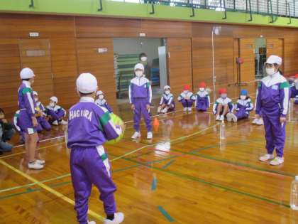 体育科の学習で、ボールゲーム「天大中小」に取り組んでいます。今日は、仲間でパスをつなぐことをめあてに練習をしました。相手のとりやすいパスはどういうパスかを考え、「胸のあたりの高さにめがけて出す」「ふんわりと山なりのパスがいいよ」と考えを出し合いました。
