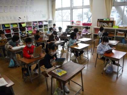 文字がすらすらと読むことができるようになってきた1年生は、図書室で選ぶ本も、少しずつ文字の多いものになってきています。