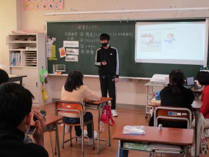 外国語科の学習では、「小学校の思い出」をテーマにスピーチを行いました。クロームブックで作成した資料に合わせて、覚えた英語で上手に話すことができました。