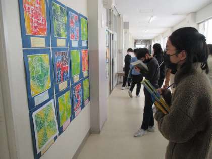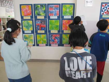 版画が完成しました。どれもきれいな色の作品になり、廊下が華やかになりました。今日は、友達の作品から思いを想像することで、作品鑑賞を楽しみました。