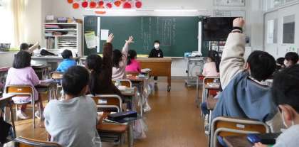 周りの子供たちは、ヒントを聞きながら、「それは、黒色ですか」「丸い形ですか」と質問も考え、尋ねました。