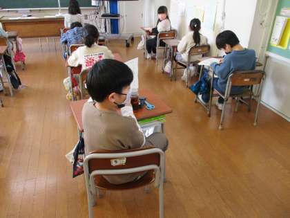 国語「カンジーはかせの大はつめい」という学習で、二つの漢字を合体させて一つの漢字を作ったり、熟語を作ったりしています。今日は、熟語を作るところを学習しました。クイズ形式で行い、楽しんで熟語作りをしていました。