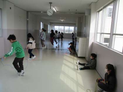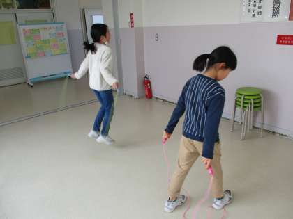 きらりタイムでは、現在、なわとびをしています。全校一斉のラジオ体操をした後、得意な技を増やしたり、記録をのばしたりすることを目標に、一生懸命頑張っています。