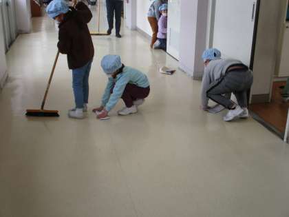 この一年間、なかよし班掃除で上級生に教えてもらいながら、掃除の仕方を教えてもらった1年生。ぴかぴか掃除名人になってきました。
