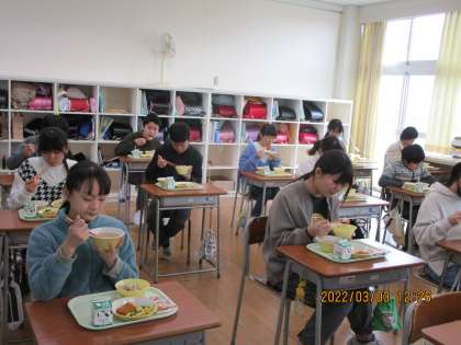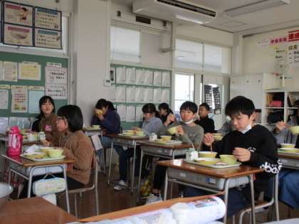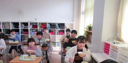 今日の給食は「卒業お祝い給食」でした。赤飯、とんかつ、プリンタルト等、子供たちの好きなメニューばかりです。おいしそうにほおばる姿がとても微笑ましかったです。