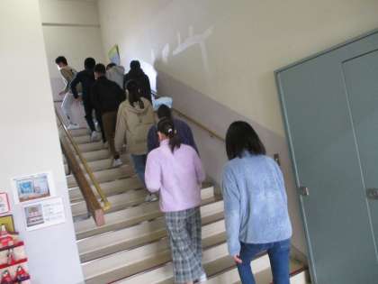 どの学年も、初めの非常ベルが鳴ると同時に動きをやめ、立て膝で黙って放送を待つ姿勢を取ることができていました。その後、放送の指示をよく聞き、近くの人とグループを作って静かに避難することもできました。