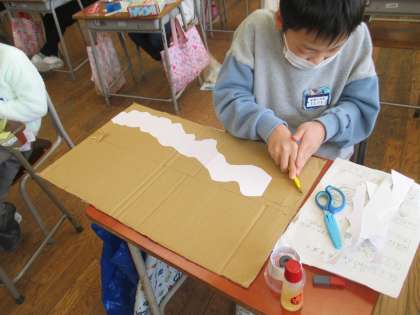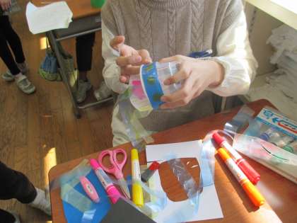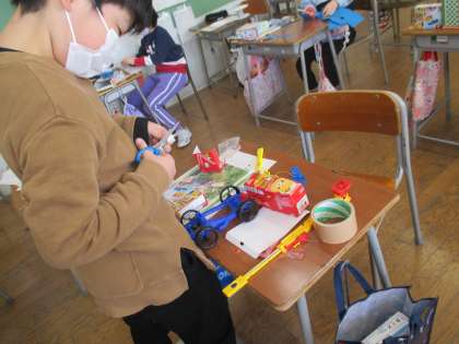 理科の学習では、一年間学習したまとめとして「つくってあそぼう」をしています。風やゴム、磁石などの性質を利用したおもちゃを、試行錯誤しながら作っていました。