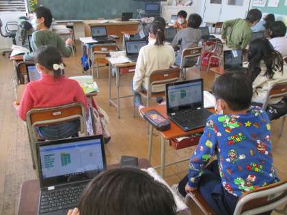 お囃子の旋律をプログラムして、音楽づくりを体験しました。