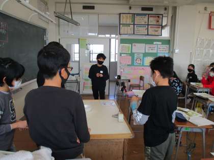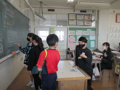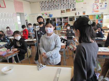 ふりこを音楽に合わせてもっとゆっくり揺らすためにはどうしたらよいか調べるために実験をしました。班ごとに役割を分担して、手際よく実験を進めていました。みんなが考えていた予想とは違い、驚いた様子を見せていました。