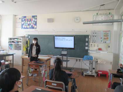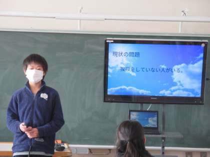 スライドで、みんなに提案したいことを示しながら自分の考えをスピーチしました。「元気よくあいさつをしよう」「名札をつけよう」「給食を残さず食べよう」など学校生活の問題点から、アンケート結果やインターネットの資料をもとに説得力のあるスピーチをすることができました。