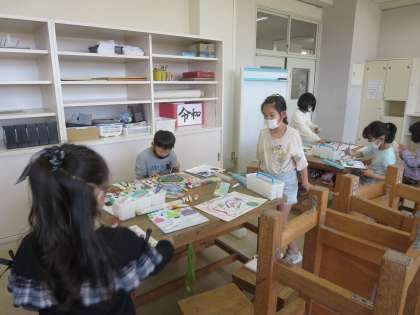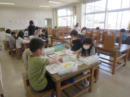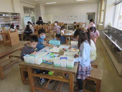 3年生は図画工作科で、色を混ぜたり、水で薄めたりするなどして色の変化を楽しむことや、筆の持ち方や力の入れ具合を変えて表現してみることなど、さまざまな表現でできた形を楽しむ学習を行いました。子供たちは夢中になって、色の変化や偶然できる形を楽しんでいました。