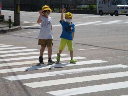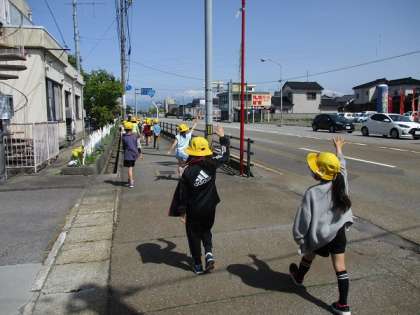 横断歩道や車の出入りがある場所でもしっかりと安全確認。手を挙げて渡ります。「自分の命は自分で守る」を大切に、これからも安全に登下校してほしいと思います。