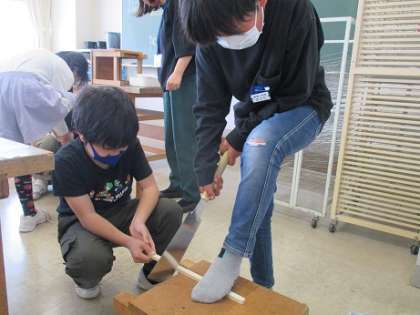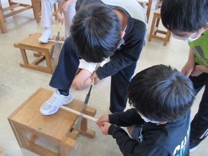 図画工作科では、新しい作品を作り始めています。コロコロガーレというコリントゲームです。木材を切ったり、釘を打ったりして完成を目指しています。