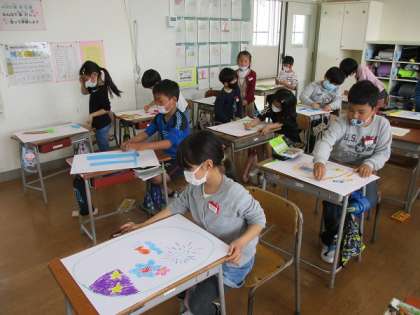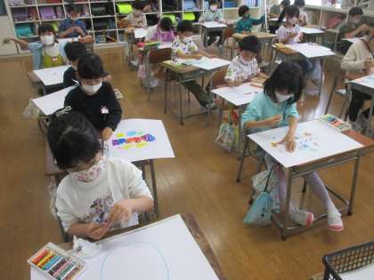 「ふしぎなたまご」はどんな形、どんな色をしているのか考えて描きました。中からどんなことが生まれてくるのか楽しみです。