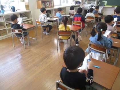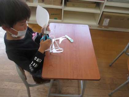 図画工作科で、はさみを使った学習をしました。1枚の紙を、できるだけ長く切ることを意識して、慎重に切っていました。