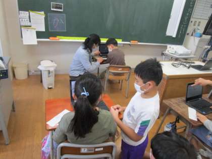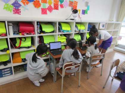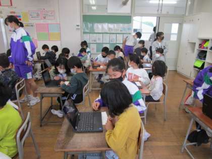 1年生が初めてクロームブックを使うと聞いて、手伝いに行きました。次は6年生がいなくても操作ができるようになることを意識して教えてあげることができました。