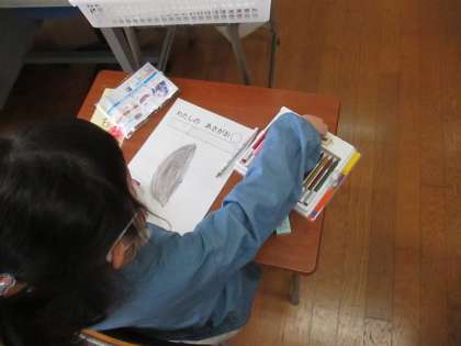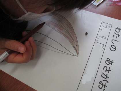 生活科の学習で、朝顔の種を観察しました。「ご飯粒みたい」「すいかの種にも見えるよ」「思ったよりかたいね」など、さまざまなことに気付いていました。