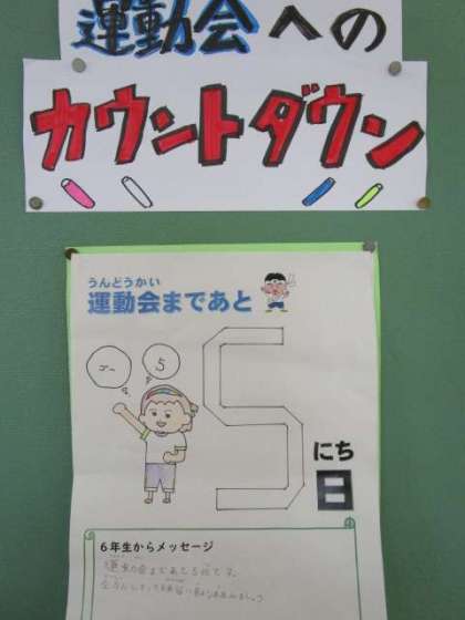 運動会まで1週間を切りました。児童玄関前には6年生が作成した「運動会へのカウントダウン」が掲示されています。メッセージからは、萩っ子みんなで思い出に残る最高の運動会にしたいという思いが伝わってきます。運動会まであと5日です!