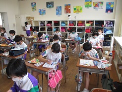 一人一人が自分の心を模様に表しました。これから作品を見合い、互いの心の模様について聴き合い、友達が感情をどのように色や形で表しているか考えます。