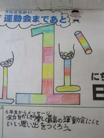 運動会まで残り1日となりました。運動会に向けて、6年生は約1ヶ月間、準備をしてきました。下級生に優しく声をかける姿、よりよい応援にしようとがんばる姿など、この1ヶ月間の間に子供たちの成長がたくさん見ることができ嬉しく思います。