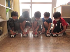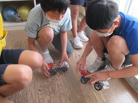 理科の学習でモーターカーを作りました。「電池・モーター・スイッチ」をどんなつなぎ方にすると速く走るか考えました。友達と見比べてつなぎ方を変えたり、一緒に走らせたりして、速く走るように工夫しました。