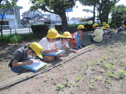 3年生は理科の学習で、ヒマワリやホウセンカ、アゲハの幼虫を育てています。前回に比べてどれくらい大きくなったか、観察を通して確かめました。