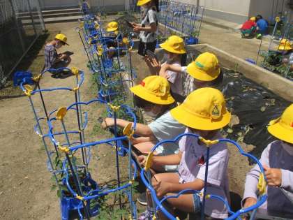 苗を植えてから、元気に生長しています。「背が高くなってる」「つぼみがある」など、見るたびに新しい発見があります。クロームブックでも撮影して記録しています。