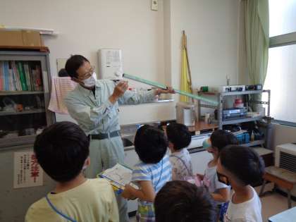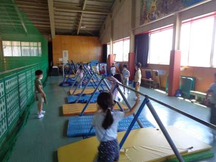 体育館と、用務員室に行きました。体育館の2階のギャラリーを見たり、器具庫を見たりしました。用務員室では、工具を実際にさわらせてもらいました。