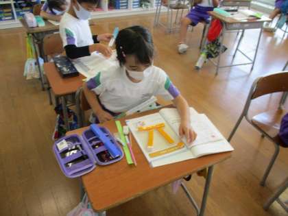算数科の学習では、「長さ」の学習をしています。初めはブロックや紙テープを使って長さを比べました。長さを分かりやすくするための方法を考えました。