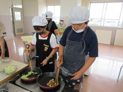 家庭科「朝食から健康な1日を」の学習で調理実習を行いました。安全に気をつけながら、バランスや彩りを考えた朝食の1品を作ることができました。