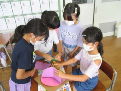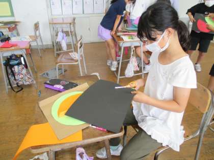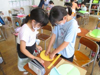 図画工作科の学習では、割りピンを使って紙が回る仕組みを生かし、どんな世界が広がっているかを想像しながら作品作りに取り組んでいます。