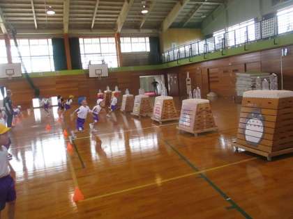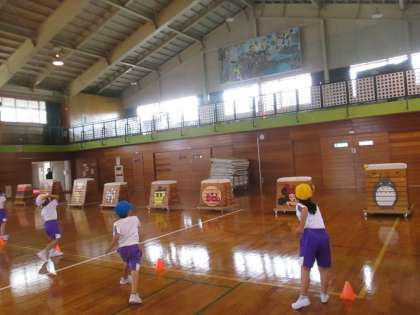 体育の学習で、ボール投げをしました。跳び箱を超えるように投げたり、跳び箱の上に置かれたペットボトルを狙って投げたりしました。コツを教えてもらったり、遠くまで飛ばすことができる友達の動きを見たりして、一生懸命活動しました。
