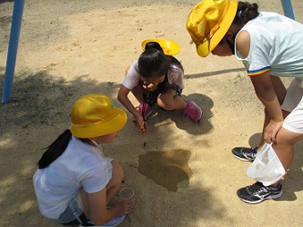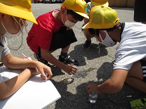 理科の学習で、雨が降ったあとに消えてしまう雨水はどこへいくのかを調べました。たくさん予想をたてるうちに、「こんな実験をしたい」「実際にやってみたい」と言う声が上がりました。調べたいこと、実験方法・場所・道具等を自分たちで決め、自分たちで実験を進めました。結果から新たな疑問が生まれたり、条件を変えて再実験がしたくなったりする楽しい学習の時間でした。