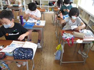 家庭科の学習では、初めての手縫いに挑戦しています。練習布を使って、手順を覚えています。いろいろな縫い方ができるようになってきました。今日はボタン付けもできました。