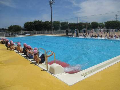いよいよ水泳学習が始まりました。今日は、プールの使い方を学んだ後、実際に入って遊びました。初めて入る小学校のプールに、緊張した様子やわくわくした様子が見られました。