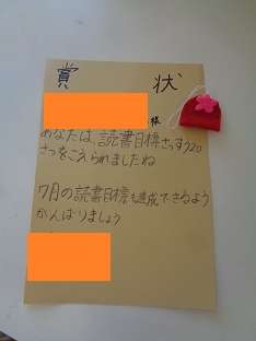 図書係の子供たちが、学級の目標読書冊数を決めて呼びかけています。今日は、6月の目標冊数達成者の表彰式を行いました。