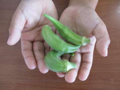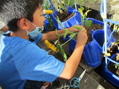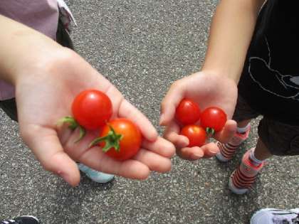 今日はオクラ、ミニトマトを収穫しました。収穫のタイミングに悩み、友達に相談して考える姿もみられます。