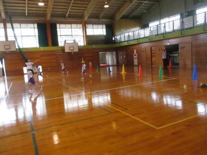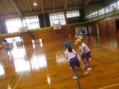 体育の学習で、いろいろな動きを取り入れた運動遊びをしました。新聞を体の前面から落とさないように走ったり、ペアになって新聞の上に置いたボールを落とさないように走ったりしました。