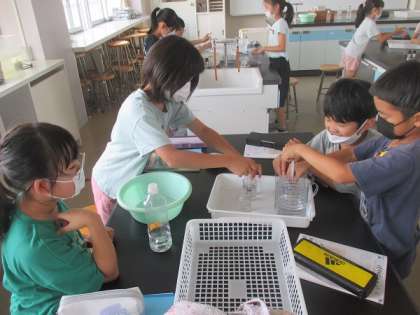 水のかさの学習をしています。1dLます等を使っていろいろな入れ物に入る水のかさを調べました。水のかさも数字と単位で表すことができることが分かりました。