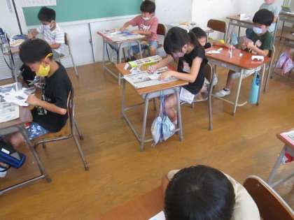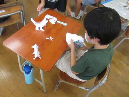 図画工作科の学習で、画用紙を折って、立てたもので作品づくりをしました。それぞれが表したいものを、折り方や立て方を工夫しながら作っていました。恐竜や車、家等、たくさんの作品ができ上がり、並べて見て楽しんでいます。