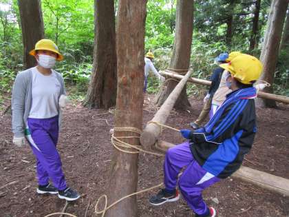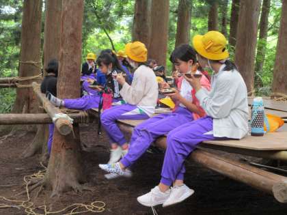 自然の家で入所式をした後、森小屋づくりの活動を行いました。事前に練習してきた「角しばり」で太い丸太を木に固定し、家の土台から作っていきました。お昼ご飯は、弁当を自分たちの小屋でおいしくいただきました。その後、森の遊び場づくりでも、ブランコやシーソー、平均台など、たくさんの遊び場を作ってみんなで楽しみました。