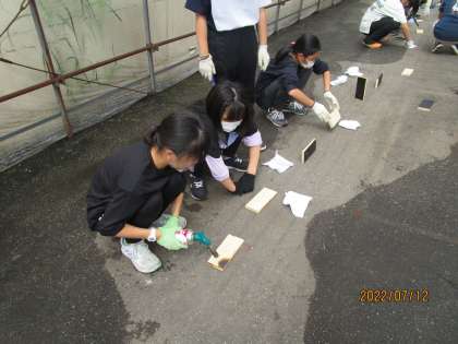 宿泊学習の思い出を焼き板に表しました。生板をバーナーで焼いた後、ブラシでこすってからイラストや文字をかきました。