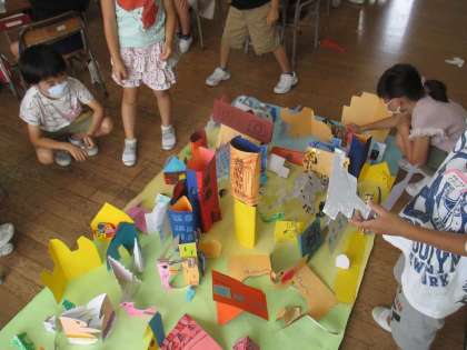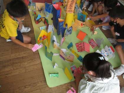 図画工作科の学習で、紙を折って立てたもので作品づくりをしていました。今回は、出来上がった作品を集めて町をつくりました。電車の近くに駅を置いたり、ビルを作った人同士で集まって並べたりと、置く位置を考えながらつくっていました。完成した町をみて、「新しい町ができたね」と喜んでいました。