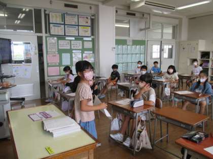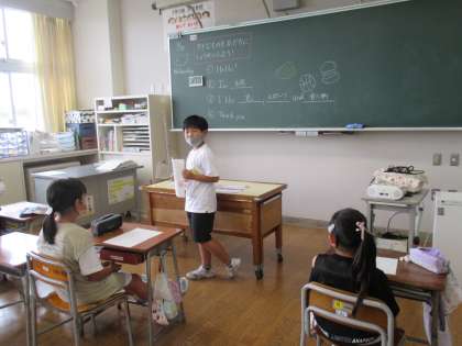 外国語活動の学習では、英語で自分の好きな物について友達に紹介しました。「I like…」の表現を用いて、楽しく発表することができました。