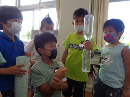 目をつないであいさつをする子、教室で友達に自分の作品を紹介する子など、教室のあちらこちらで元気な姿が見られました。