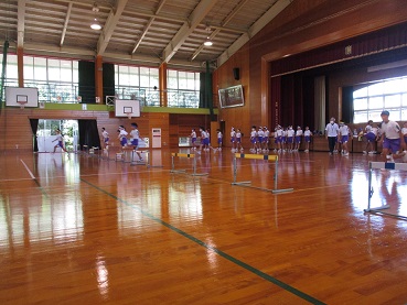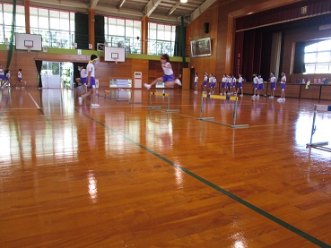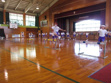 体育科では、ミニハードルに挑戦しました。歩幅や空中姿勢に気をつけてたくさん練習しました。練習を重ねて得意な方の足で踏み切ったり、引っかからないように修正したりと成長する姿が見られました。