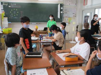 理科では「月と太陽」の学習をしています。ボールを月に見立てて、どんな形の月が見えるのかをグループで実験しました。