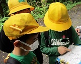 近くの森へ出かけました。もうすっかり秋らしく、栗の実を見付けたり、ひんやりとする風を感じたり、しっとりとした草木を眺めたりしながら、ポイントを探しました。友達と手を取り合い、足場の悪いところもがんばって進んだり、一枚の地図を見合って、歩き方をじっくり考えたりしました。