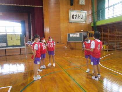 色団毎に作戦を立てて練習をしています。2組との試合が楽しみです。